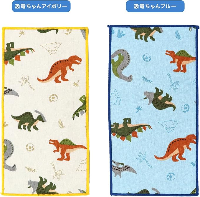 【キッズハーフハンカチ6枚/Y-ダイナソーセット】恐竜柄5種(ダイナソー水色・ダイナソーアイボリー・ダイナソーネイビー・恐竜ちゃんアイボリー・恐竜ちゃんブルー)のうちランダムで4種+ストライプスター3色のうちランダムで2枚