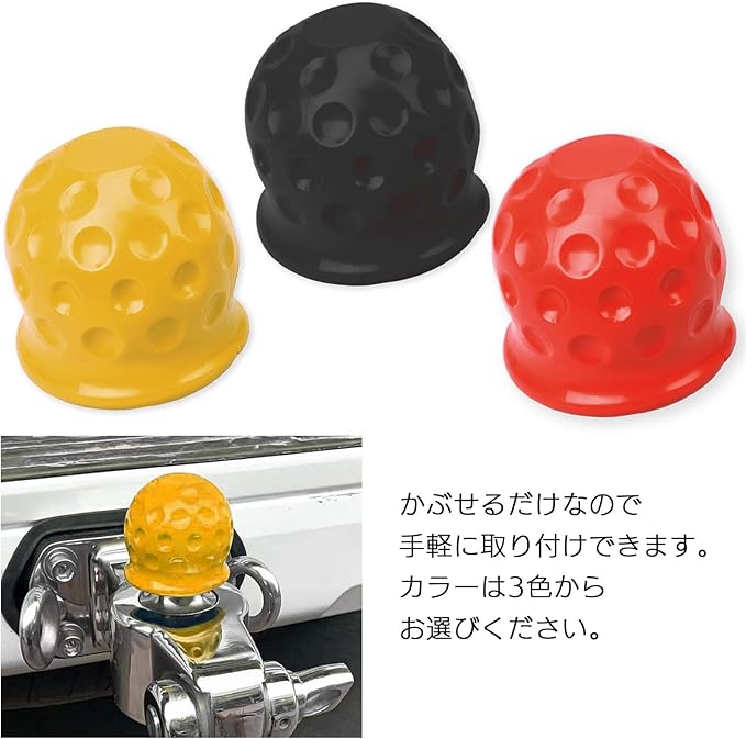 ヒッチボールカバーはポップなカラーで、後続車両や歩行者に対する視認性向上にも役立ちます。レッド、ブラック、イエローの3色があり、サイズについては画像をご確認ください。