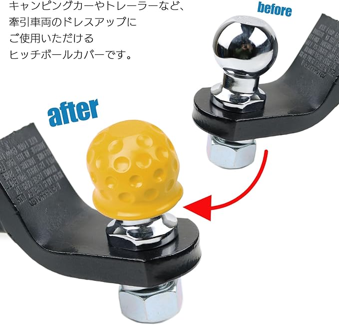 カバーはゴルフボール型で、ボート、バイク、トレーラーなどを牽引する際のヒッチボールを汚れから守ります。スタイルをアレンジする楽しさもあり、使うシーンに応じて色を選べます。