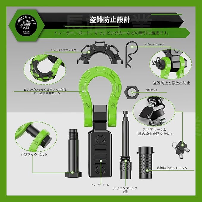 車 シャックルヒッチレシーバー 牽引フック 8ton トレーラー ヒッチ フック アルミニウム合金製 8トン牽引力 カート トラック オフロード キャンピング 保護カバー付き 防錆 救助 弓型 (グリンー)