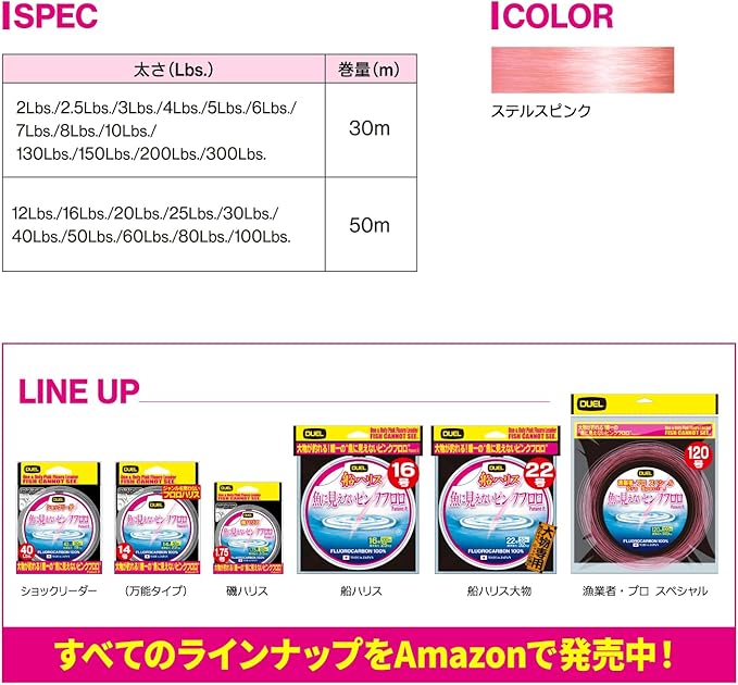 デュエル(DUEL)魚に見えないピンクフロロ ショックリーダー 30m 2Lbs~10Lbs / 50m 12~100Lbs / 30m 130~300Lbs