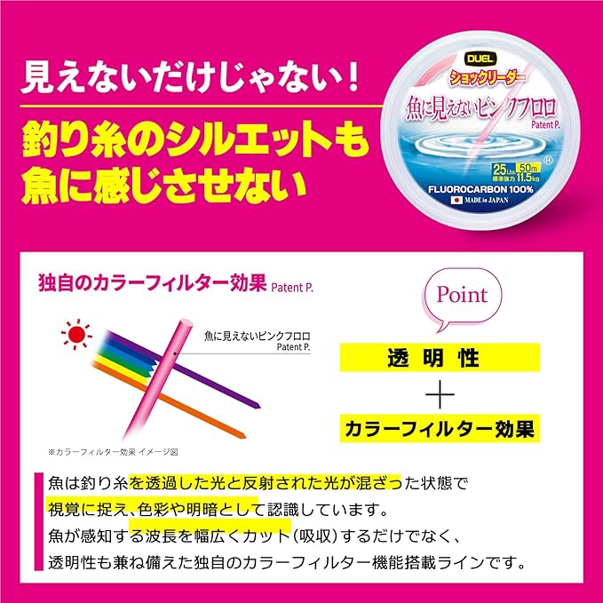 ◆人に見やすく魚に見えにくい「ステルスピンク」採用、一般的なピンクラインよりも幅広く”魚に見えない色相領域”をカバー