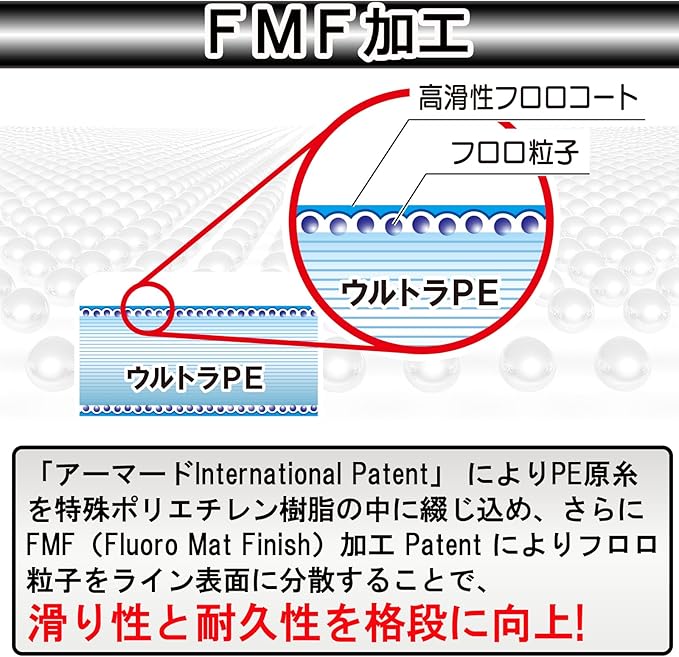 【ウルトラPE フロロカーボン シリコン】:扱いやすく、トラブルレス。さらにコントロール性能30%アップ。横風や向かい風下での影響を受けにくく、投げたルアーの弾道安定。だから狙ったコースをトレースできる。キャスト時の糸フケが出にくいからルアーの立ち上がりが早い。