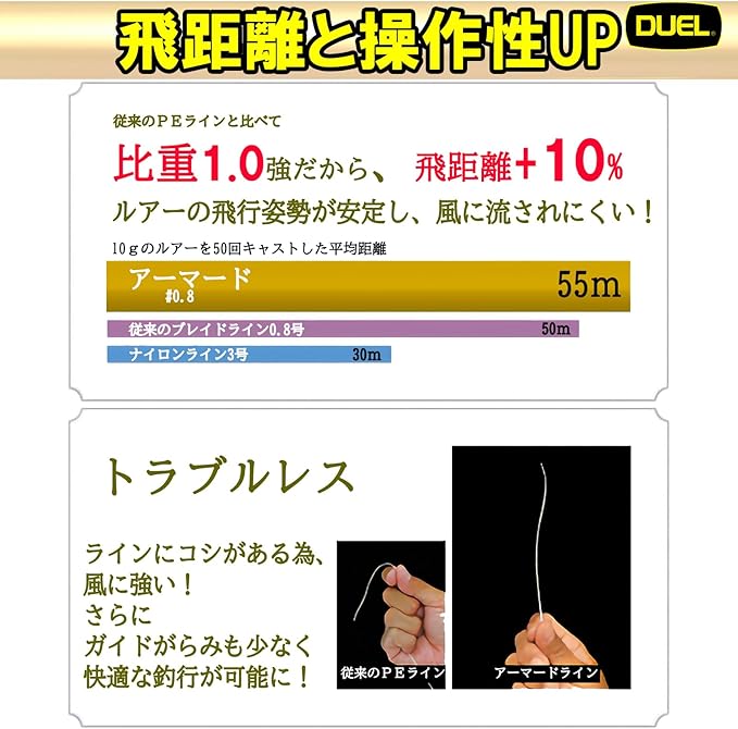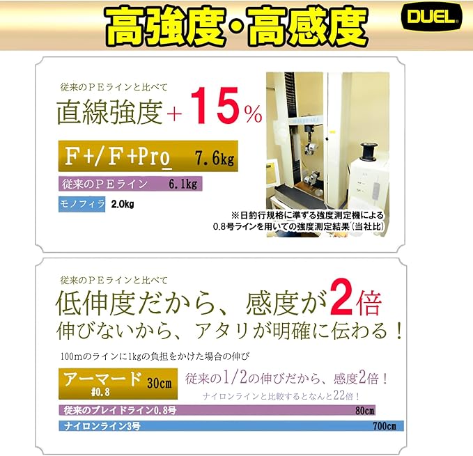 従来PEラインより直線強度15%アップ・低伸度で感度2倍・飛距離最大10%アップ