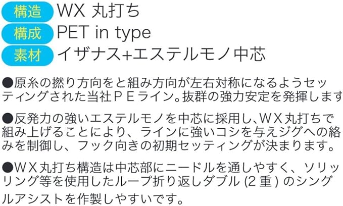 反発力の強いエステルモノを中芯に採用し、WX丸打ちで組み上げることにより、ラインに強いコシを与えジグへのカラミを制御し、フック向きの初期セッティングが決まります。