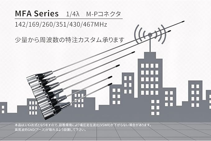 本品は1/4λ形式となりますので、設置環境により電圧定在波比(VSWR)が下がらない場合があります。高周波的GND(アース)が取れるよう設置して下さい。