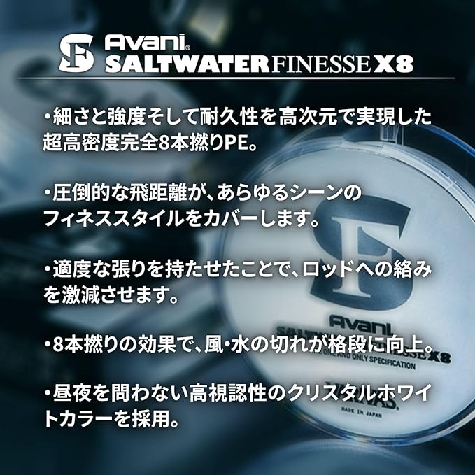 探究者に贈る、究極のソルトウォーターフィネスPEライン。ソルトウォーターフィネスの探究をコンセプトに、細さの限界に挑み生まれた本製品は、まさに「premium quality」を掲げるVARIVASラインのフラッグシップモデルだ。細さ、強度、耐久性をこれまでにないレベルで実現した「SALTWATER FINESSE PE X8」が現状に満足しない探究者を必ずや至福の時間へと導くだろう。・細さと強度そして耐久性を高次元で実現した超高密度完全8本撚りPE。・圧倒的な飛距離が、あらゆるシーンのフィネススタイルをカバーします。・適度な張りを持たせたことで、ロッドへの絡みを激減させます。・8本撚りの効果で、風・水の切れが格段に向上。・昼夜を問わない高視認性のクリスタルホワイトカラーを採用。