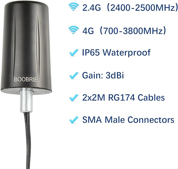 BOOBRIE 4G LTEアンテナ700-3800Mhz n78/n77+ 2.4Ghz WIFIアンテナ2400-2500Mhz 室外 高感度SMAオス 2M RG174ケーブル2x2 MIMO 無指向性アンテナ