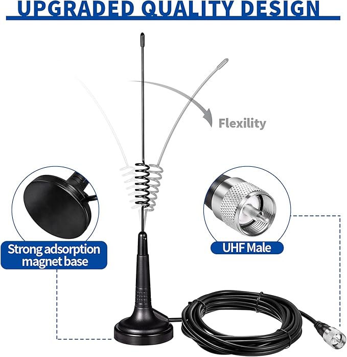 様々なブランドのCBラジオと互換性があり、CBラジオの受信品質と受信範囲を向上させます。このアンテナは持ち運びやすく、軽量で耐久性に優れた設計で、26MHz~28MHzのCBラジオ周波数範囲内のすべてのチャンネルで動作します。