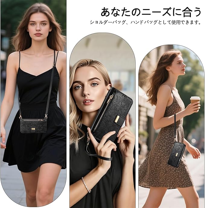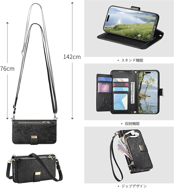 TOO&SOO 対応 いphone17promax ケース 手帳型 肩掛け iphone 17 pro max ケース ショルダー スマホケース アイホン17プロマックス 斜めがけ 人気 アイフォン17promax 携帯カバー 花柄 斜め掛け 女性 肩がけ ストラップ付き 小銭入れ カード収納 スタンド機能 シンプル お洒落 衝撃吸収 - ブラック