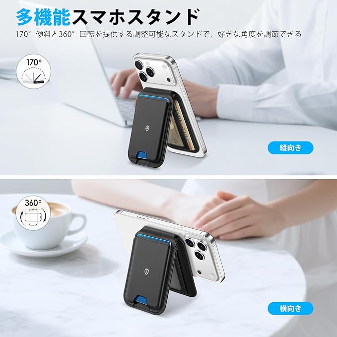 【本革素材・スタンド機能】本商品は本革を採用し、シンプルなデザインで、ビジネスからプライベートまで様々なスタイルにぴったりで、多様な場面で活用できる高級感が溢れカードホルダーです。縦向き、横向きから好きな角度を調節できて、手放しでも動画視聴や読書に楽しめています。時間とともにレザーが経年変化することがあるし、レザーが活気を呈して、風格を表現しました。仕上げのため、異なるの人々使用したの外観は若干異なることがあり、ご注意ください。
