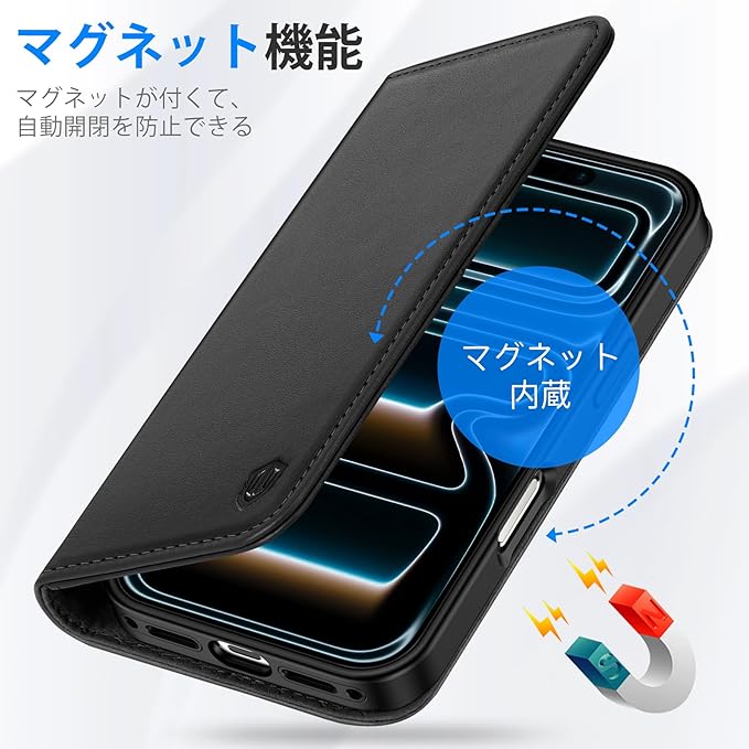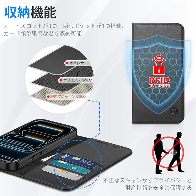 【RFIDブロッキング技術採用】本iPhone 17 ProMaxケースのカードスロット&ポケットの裏地には、RFIDブロッキングライニングを採用しています。先進的なRFIDブロッキング技術により、信号をブロックし、ICカードの情報や個人情報などを安全に守ります。信号がブロックされるため、カードをケースに入れたまま反応しない場合は、カードを取り出してお使いください。
