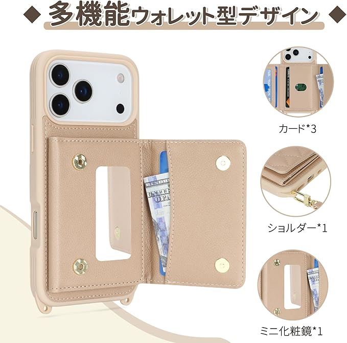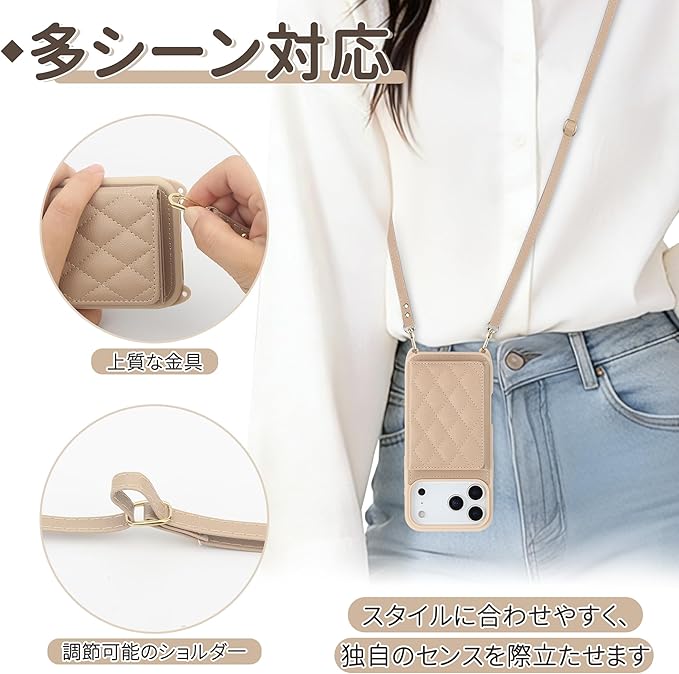 iPhone 17 Pro Max 用のケース 手帳型 ショルダー アイフォン 17 Pro Max 用の 手帳型 肩掛け スマホケース いphone17 Pro Max 対応 斜めがけ 首掛け 鏡付き 軽量 PUレザー 耐衝撃 携帯ケース カード収納 小銭入れ ストラップ付き かわいい 携帯ケース カード入れ チェック柄 ベージュ