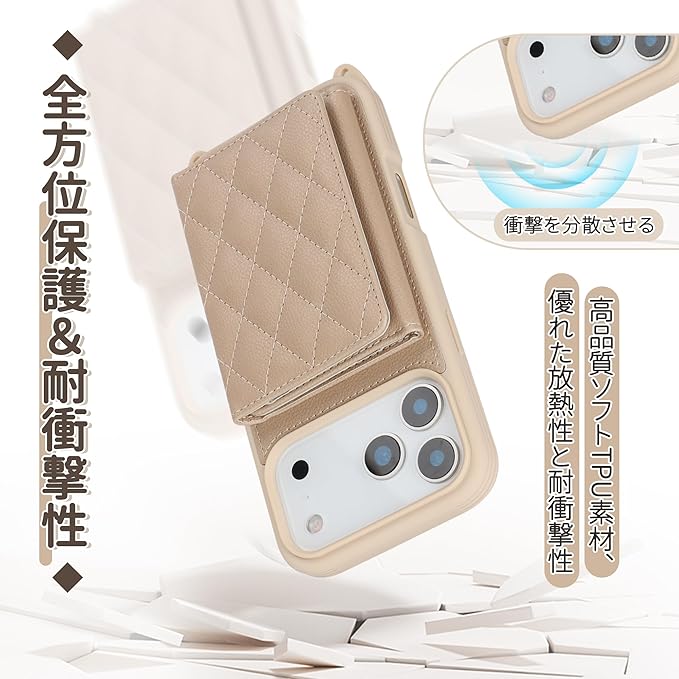 【キルティング加工PUレザー】厳選された柔らかく繊細な高品質PUレザーに、クラシックな菱形キルティング模様を組み合わせ。視覚的に優雅でスタイリッシュなだけでなく、シルクのように滑らかなラグジュアリーな肌触りを実現。耐傷性・耐摩耗性・指紋防止機能を備え、日常使用でも跡を残さず、長く新品同様の美しさを保ちます。内蔵の厚手TPU耐衝撃インナーケースが本体に密着し、落下衝撃を効果的に吸収。あらゆる衝撃や落下から端末を全面的に保護します。外側のレザーは柔軟にフィットし、内側の緩衝構造は堅牢で信頼性抜群。剛性と柔軟性を兼ね備え、安心してお使いいただけます。
