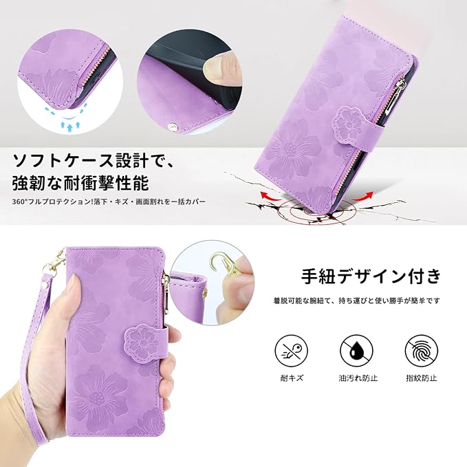 CASAFUNY 適用【iPhone 17 Pro Max ケース 手帳型 ショルダー】肩掛け 斜めがけ 手首かけ 掛けストラップ付き 長さ調整可能 適用6.9インチ アイフォン 17 プロ マックス ケース 手帳型 ファスナー型 小銭入れ 大容量 カード収納 財布型 用の iphone17プロマックス スマホケース かわいい 美しい桜の柄 携帯カバー マグネット式 スタンド機能(パープル)