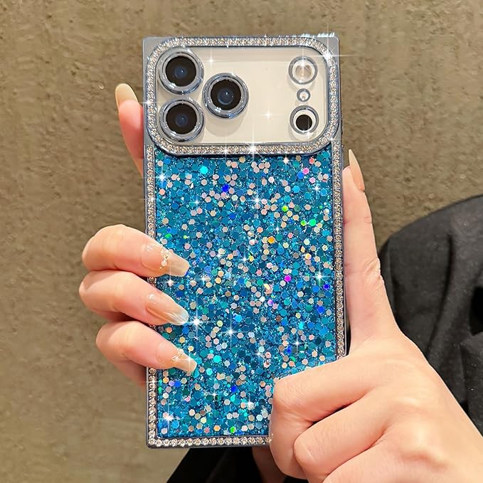 LAPOPNUT iPhone 17 Pro Max 用 ケース キラキラ ラメ ラインストーン おしゃれ スマホケース 長方形 直線エッジ 人気 可愛い 耐衝撃 落下防止 軽量 落下保護 衝撃吸収 カバー 携帯ケース(ブルー)