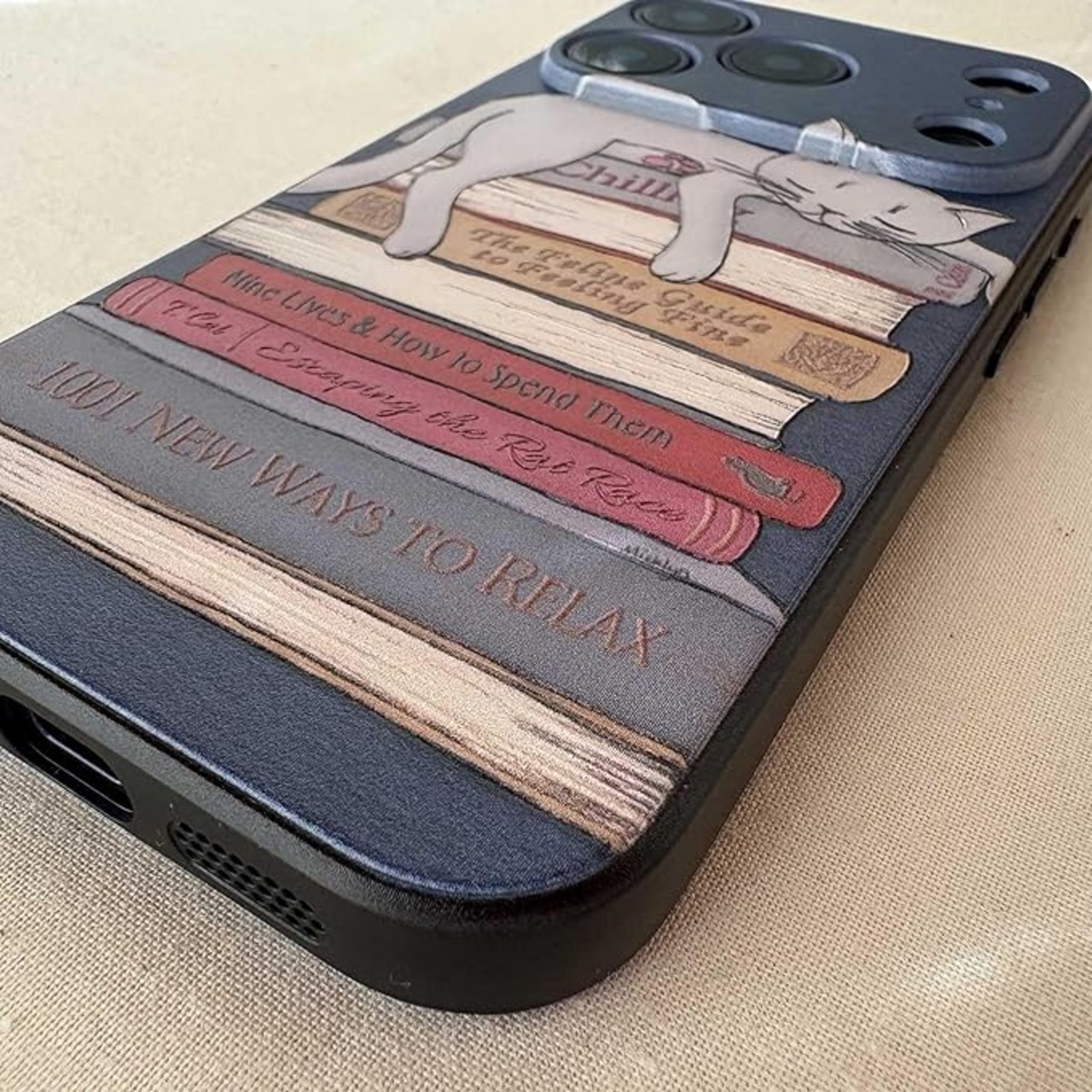 【柄】 積まれた本の上で寝ている可愛いグレーの猫の軽量スマホケースです!15ProMax対応は上部が穴が開いているため柄を下へずらしています。