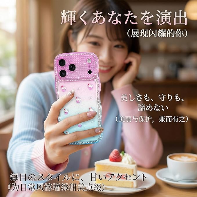 【魅力的なグラデーションデザイン|立体装飾】半透明グラデーションバックパネルに、キラキラしたラメを施し、光の動きで夢のような輝きを生み出します。背面には可愛い立体3Dデコレーションを配し、樹脂コーティング技術でしっかりと封じ込められているため、かわいいアイテムが外れにくく、長く美しい外観を保ちます。