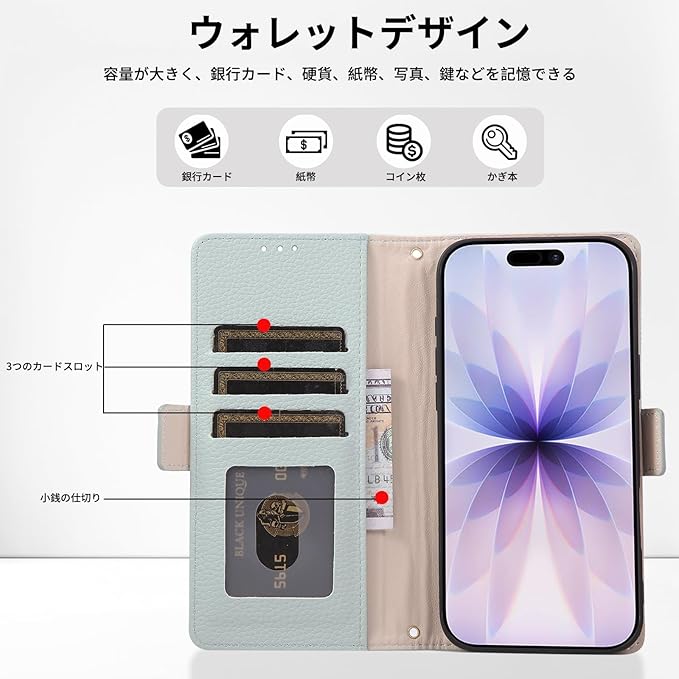 【カード収納 横置きスタンド機能】手帳型ケースは便利なカードスロットが3つと、大型ポケットを1つ搭載されて、カード、お札、チケット、定期券、名刺などをポケットに収納でき、1つで出掛けられる手軽さ。便利な横置きスタンド機能が付き:背面を折り曲げることにより、スマホを横向きで固定可能、キッチンやデスクで作業をしながら、手軽に動画コンテンツを視聴できる。