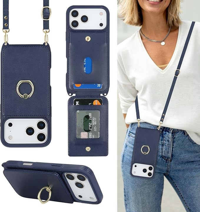Cavor iPhone 17 Pro Max と互換性があるケース手帳型iPhone 17 Pro Max 用のケースショルダーストラップ クロスボディ肩掛け 首かけ 斜めがけ 背面ポケット付き財布カバー【上下開】iPhone 17 Pro Max 用のケースカード収納【RFID機能】case 360 回転リング 横置磁気機能 落下防止/持ちやすい-ダークブルー