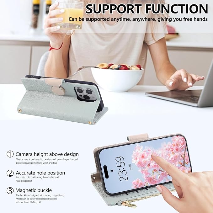 【カード収納&スタンド機能】 iphone17promax ショルダー ケースは多機能ポケットで使いやすさ&収納力満点の仕上がり、3つのカードスロットと、ファスナー型小銭入れを備えた充実した収納、クレジットカード、ICカード、コイン、名刺、小銭やお札などを収納できる。近所の買い物や犬の散歩などでは、スマホ1台だけで身軽に外出でき、通勤やお出かけにも便利。便利なスタンド機能付きで、好きな角度に調整してビデオ通話、Web会議、動画視聴、料理中のレシピ確認など、さまざまな場面で活躍する。
