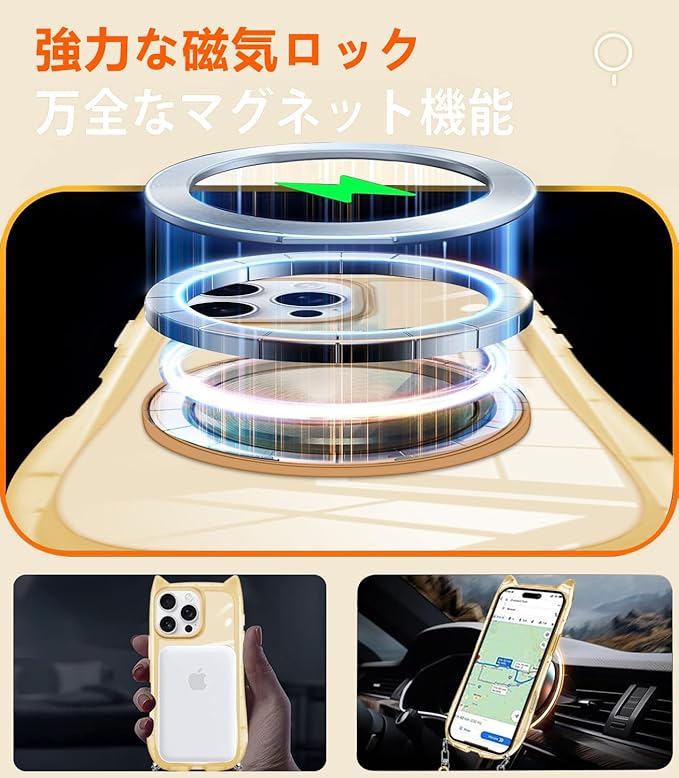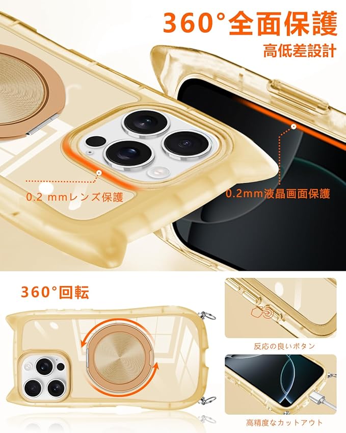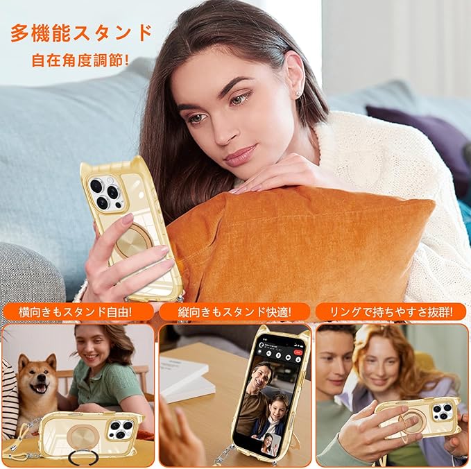 【iPhone 17promax 専用ケース】ご購入の際は必ずご確認ください。品質に問題がある場合は、いつでもお問い合わせください。 【高品質素材】全体に柔らかい TPU 素材を使用しており、優れた衝撃吸収性能を持ち、落下やぶつける衝撃を効果的に緩和します。背面は猫耳の色と同じカラーで、滑りにくく、持ち心地が良いです。 【使い勝手抜群】別途スマホスタンドを買う必要も、代用品を探す必要もありません。360 回転が可能なリングスタンドが付いており、縦置きでも横置きでも安定して支えることができ、多角度で自由に調整が可能です。視聴を楽しみながら、首や肩の周りをリラックスさせ、指や腕の疲れを軽減します! 【快適な持ち運び】着脱可能なネックストラップが付いており、長さを自由に調整できます。胸元に斜めにかけても、首に巻いても自由に切り替えられます。高い耐磨耗性の素材を厳選しており、引っ張り強度が高く、摩擦に強く、長期使用しても新品のままです。ショッピングや旅行の際に、スマホをしっかりと吊るすことができ、両手を完全に解放します。買い物に袋を持ったり、景色を撮影したりする際にも全く負担になりません。外出がもっと楽になります!