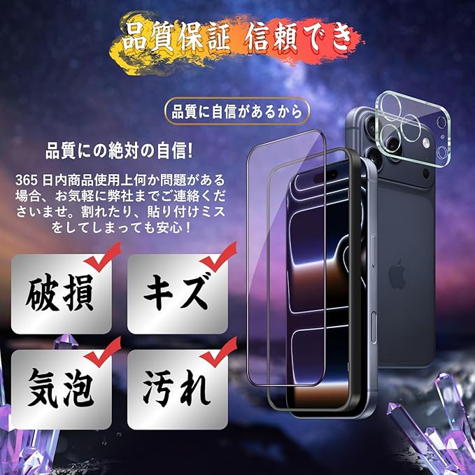 【気泡ゼロ&貼付け簡単】気泡防止加工が施されているので、気泡が入りにくい。万が一気泡が入ってしまっても時間が経てば徐々に抜けるので 美しい仕上がりに。自動吸着機能あり、ガラスをレンズスクリーンに軽く押すだけで自然に画面に吸着できます。初心者やフィルム貼りが苦手の方にも安心です。