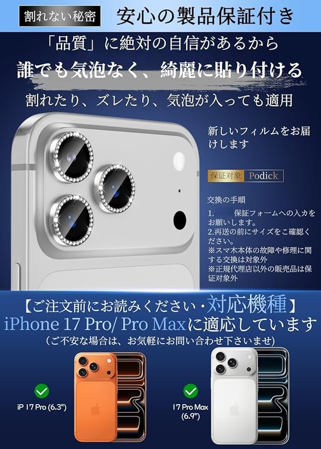 【対応機種・貼付け超簡単】iPhone 17 Pro/17 Pro Max専用カメラレンズプロテクター。フィルム接着面にはナノ静電吸着技術を処理され、位置を合わせて置くだけで簡単に貼り付けます。誰でも気泡なく、綺麗に貼り付けます。※品質保証付き:当店でご購入の製品は1年間の保証サービスをご提供しております。『初期不良の場合』『違う商品が届いた場合』『ヒビ入り/割れた場合』、注文履歴からお問い合わせください。お客様からのお問い合わせ内容に応じて返金対応を提供いたします。