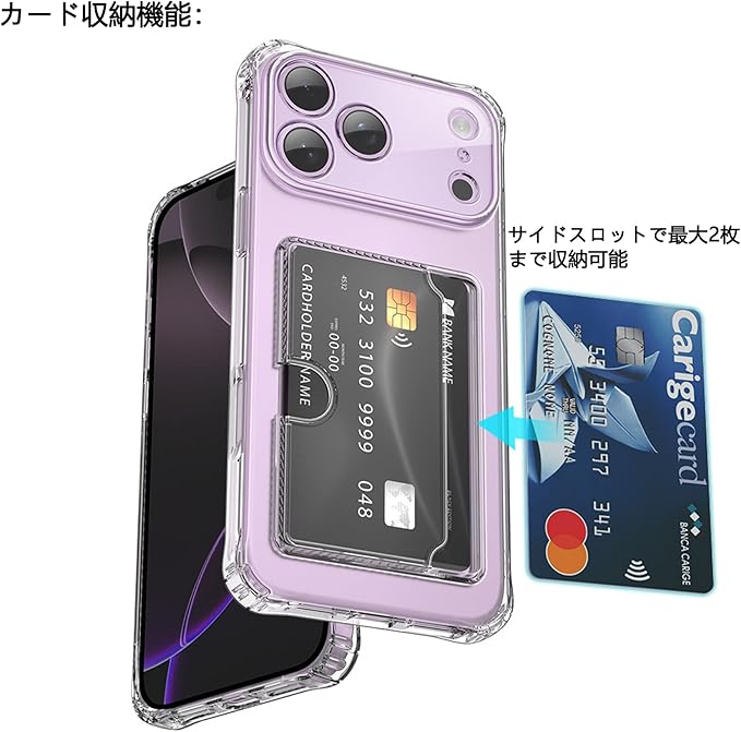 【カードスロット設計】:本体の背面側面部分に専用のカードスロットを設置。日常よく使うカード(交通系ICカード、オートロックカード、キャッシュカードなど)を1~2枚収納できます。透け感のあるクリアバックデザインで、スマホ本体の色や美しいデザインを損なわずにお楽しみいただけます。