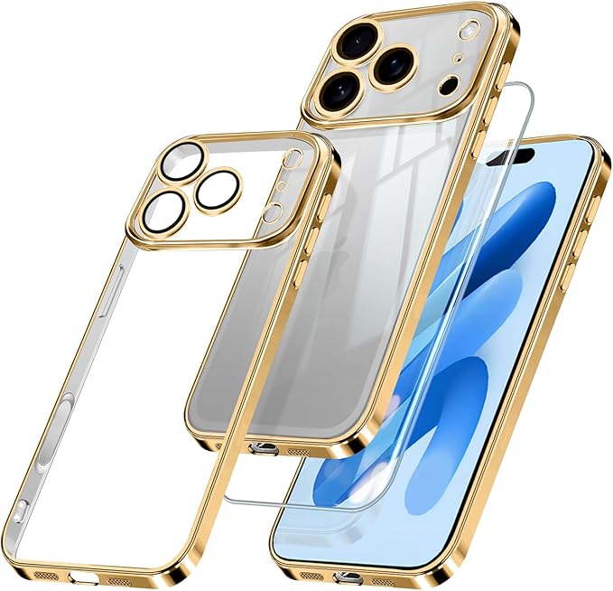 iPhone 17 Pro Max 用 ケース クリア ガラスフィルム アイフォン 17 ProMax カバー iphone17ProMax スマホケース 透明 TPUバンパー 薄型 ストラップホール付き ワイヤレス充電対応 6 .9インチ クリアケース ゴールド