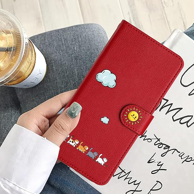 対応 iPhone17 Pro Max ケース 手帳型 耐衝撃仕様 - あいふおん17 Pro Maxケース手帳型 スタンド機能&カード収納付き 薄型軽量 いphone17 Pro Maxケース 可愛い猫デザイン - 赤