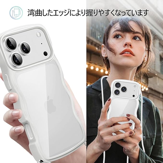 iPhone 17 Pro Max 用 ケース クリア ショルダー アイフォン 17 Pro Max 用 カバー うねうね 透明 人気 かわいい 耐衝撃 スマホケース ストラップ付き 取り外し可能 長さ調整可能 首かけ 肩掛け 薄型 軽量 TPU ワイヤレス充電対応(ホワイト)
