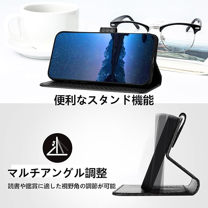 【便利な機能】このケースには3つのカードスロットがある、1つのカードスロットには、カードを取り出しやすいように大きな穴が開いている、内側には大きなポケットがあり、名刺や定期券の収納に最適。また、ケースはスタンド機能にも対応しており、横置きスタンド機能を使えば、スマホをテーブルの上に水平または斜めに置き、必要に応じて角度を調整できるので、両手を空けて読書やビデオ鑑賞などのレジャーを楽しむことができる。