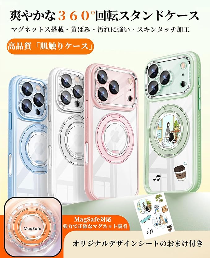 【対応機種&製品特徴】 For iPhone 17 ProMaxケース(6.9インチ)。360度回転スタンド付き、マグネット搭載でMagSafe対応、このアイフォンケースのハイライトは取り外し可能なカメラカバー・御洒落でキラキラ・クリア背面・肌触りオイル塗装で黄変防止&汚れ防止、機能性と保護性能を両立したこだわりのiPhoneケース。商品について御不明な点や不具合がございましたらいつでもお気軽に連絡ください。