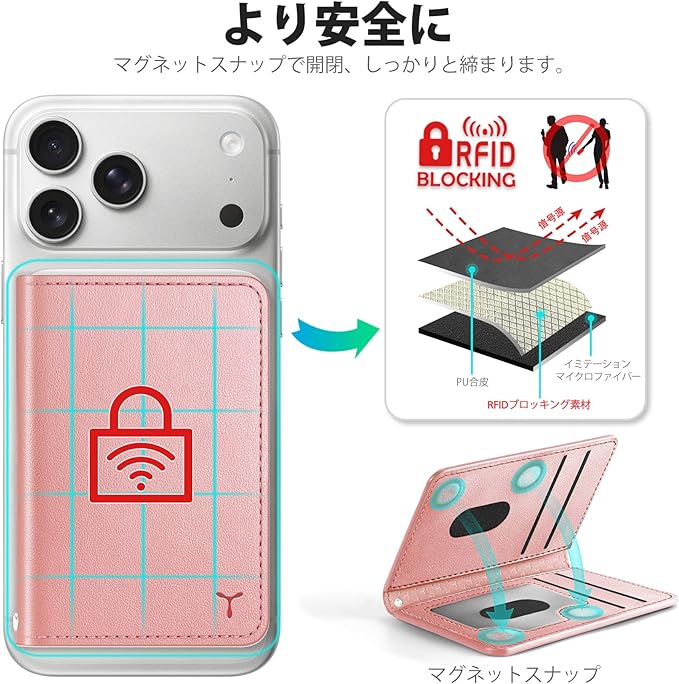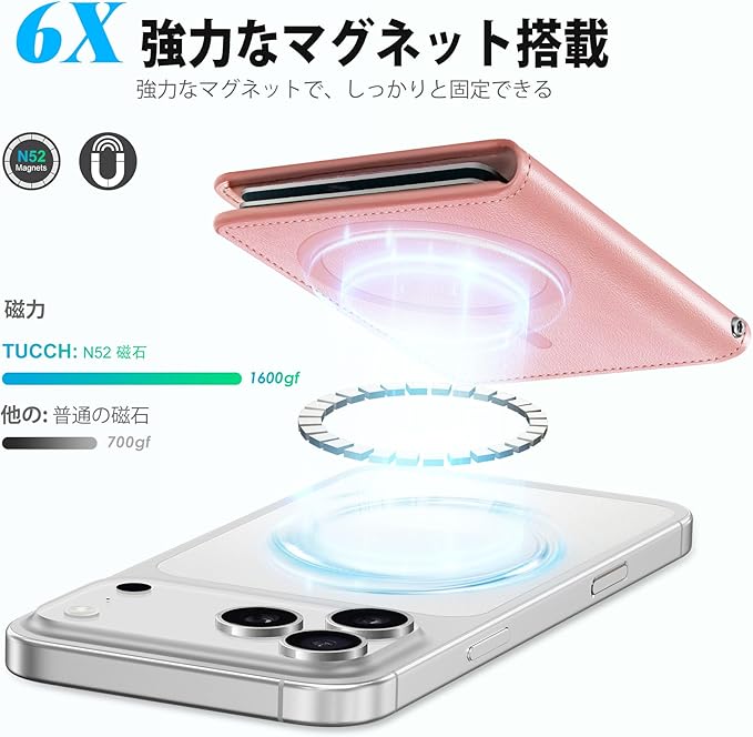 [TUCCH] スマホカードケース 磁気吸着 6枚カード収納 [RFIDブロッキング] PU合皮 脱着簡単 軽量 背面 カードウォレット 磁気ウォレットケース iPhone17/16/15/14/13/12シリーズ対応 ローズピンク