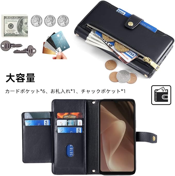 【実用性】①:収納力抜群 カード収納が沢山あります。ファスナー式の小銭入れ、窓口式のカード入れ、カードスロット複数付き、それにピタッと閉じるマグネット式の留め具とスナップ式のプリップにより、大事なカードたちを完全に保護します。銀行カード、交通カード、ICカードなどのカード類、名刺、定期券、小銭などを入れて収納でき、ケースと財布一体型の大収納のデザインで、ちょっとした買い物や散歩に出かけるときは、このスマホケースを持っていけば十分です。②二種類のストラップ付き:▶肩掛けのストラップ 肩掛けのストラップの長さが調整しやすいのです、特にポケットがない服が多いのでストラップ付きなのがとても便利です。お出かけ時はショルダーに、家でゴロゴロする時はご自由に外します。▶ハンドストラップ ハンドストラップを自由に上下ストラップ穴を付ければ、いつでも落下防止できます。