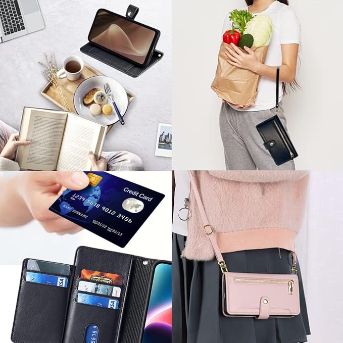 for iPhone 17 Pro max ケース 手帳型 ショルダー FOR アイフォン 17 プロ マックス 斜めがけ 手帳 ケース 財布型 【 ストラップ 長+短 2本】携帯カバー お財布付 肩がけ 首掛け ファスナー型 長さ調整可能 小銭入れ カード収納 スタンド機能 マグネット式 PUレザー ブラック