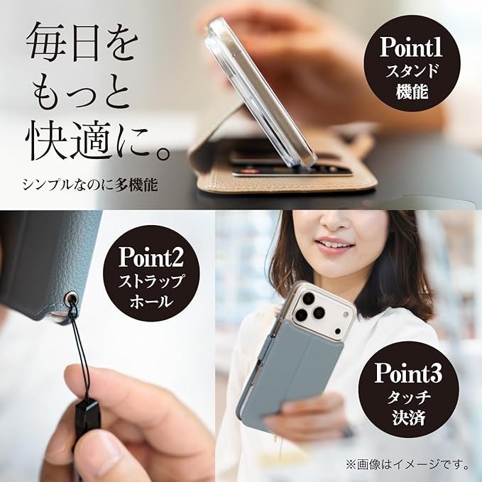 【製品特徴】… ◆ ストラップホール : あり ◆ Qi ワイヤレス充電 : 対応(機器によって非対応の場合あり) ◆ 装着時の本体色 : 見えない ◆ カード収納 : あり(4枚) ◆ 留め具 : あり ◆ スタンド機能 : あり ◆ ガラスフィルム互換性 : メーカーにより一部非対応 ◆ ご注意 : ※ストラップホールを使用の際は、ストラップを持って振り回したり、無理に引っ張ったリしないでください。