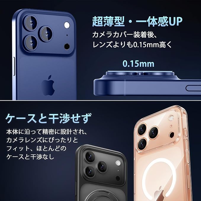 【対応機種】iPhone17ProMax専用カメラ保護カバーで、カメラレンズを全面保護します。独自技術により、レンズとプレートが純正一体の設計で隙間がなく、密着性が高くて埃が入れない、空気も霧もなく、眩しさもない。レンズは脱落することがありません。