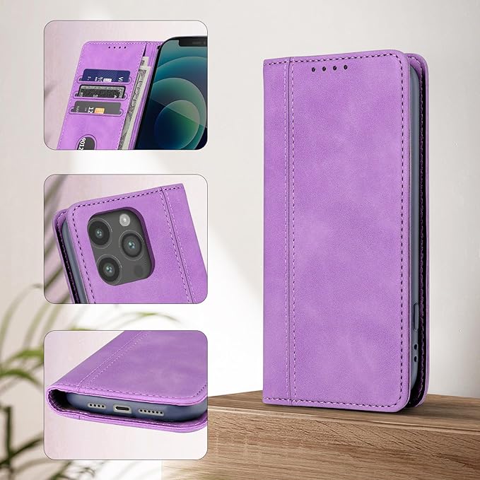 適用 iphone 17 pro max ケース 軽量 薄い PU レザー マグネット カード収納 耐衝撃 スタンド 手作り 持ちやすい 滑り止め すり傷防止マグネット 横置きスタンド機能 財布型 落ち着いた色 お洒落 カバー 落下防止 手触り良い-パープル