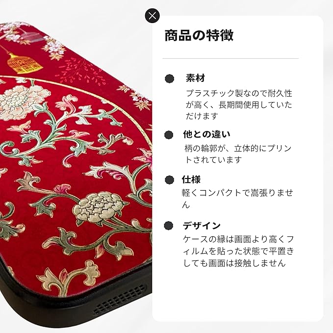 【柄】 左側は瑠璃柄。右側は鳥と鳥籠のシノワズリ柄のスマホケースです。カラーはやや暗く深みのある赤です。