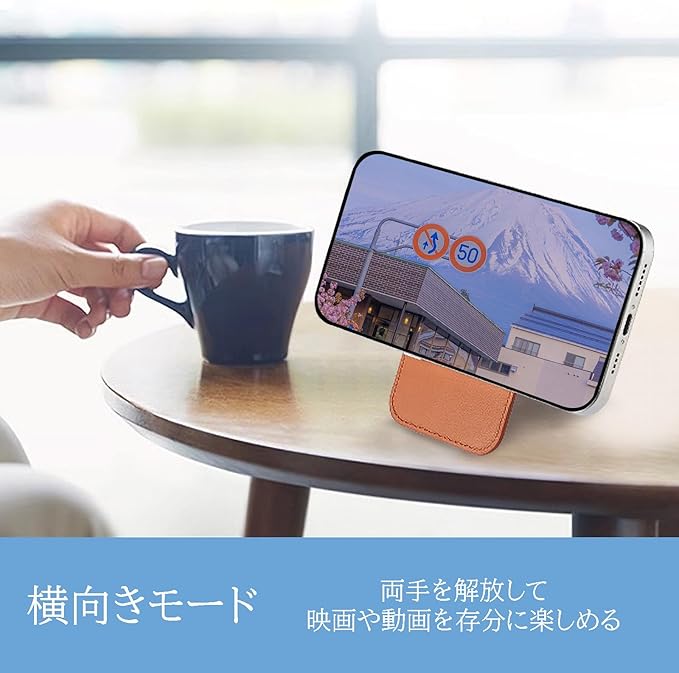 【スタンド機能付き】 軽く広げるだけでスマホスタンドに早変わり。縦・横どちらにも対応し、動画視聴や通話に最適。