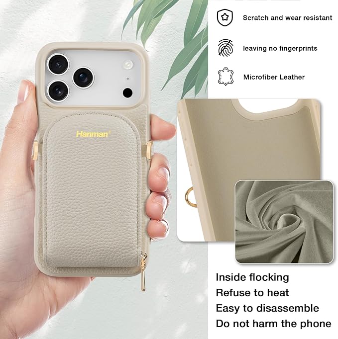 Hanman クロスボディウォレットケース と互換性のあるiPhone 17 Pro Max,取り外し可能なストラップとブレスレット付き,札入れ2つ、カードスロット4つ付き-ベージュ