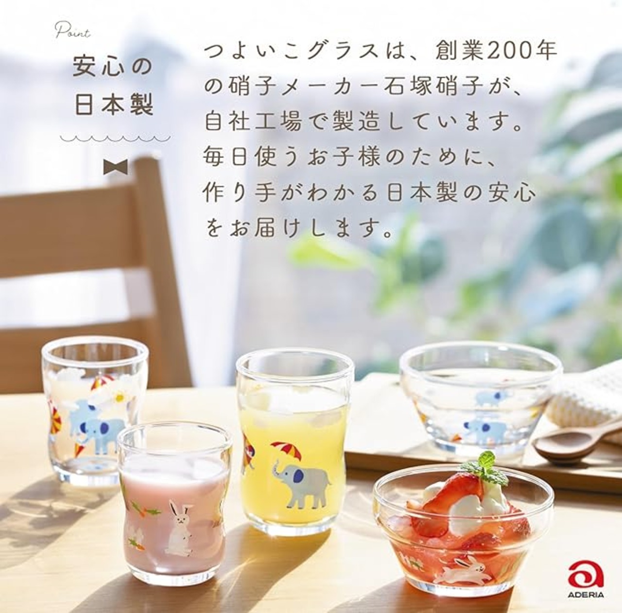 硝子は割れるから、と子どもから遠ざけるのではなく、物を丁寧に扱う心を育んだり、天然素材である硝子という「本物」に小さな頃から触れさせることが大切。「つよいこグラス」は食育指導士でもある保育士さんのそんな視点から生まれた子ども用のガラス食器です。
