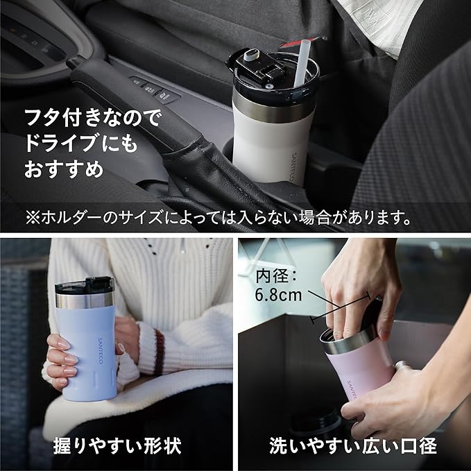 飲み口のフラップはロックされるので、傾けて飲むときもフラップを手でおさえたり気せずに飲むことができます。ストローを入れて飲むこともできるので、ドライブにもオススメ※飲み口サイズは18 8mm