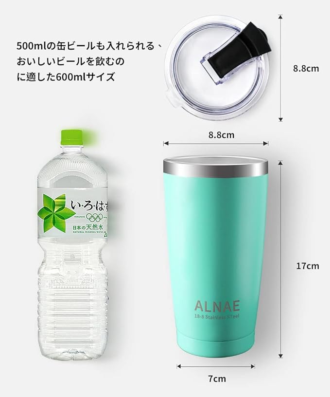 ALNAE タンブラー ふた付き600ml 真空断熱 魔法瓶 二重構造 マグカップ ステンレス コーヒーカップ コンビニマグ 大容量 ビール コーヒー 直接ドリップ ミントグリーン