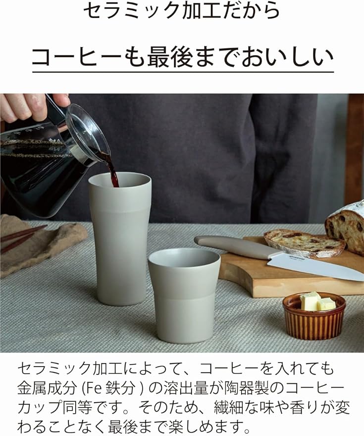 【内外面セラミック加工】金属の嫌なにおいがなくドリンク本来の香りや味わいを最後のひと口まで堪能することができる