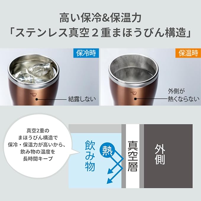 冷たい飲み物を入れても結露しにくく、熱い飲み物を入れても外側が熱くなりにくい