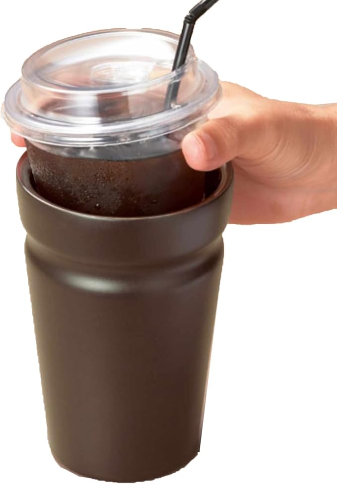 コンビニやコーヒーチェーン店のカップが入る、持ちやすい形状の真空ステンレス製タンブラー。食洗機対応塗装、車内ドリンクホルダー対応。
