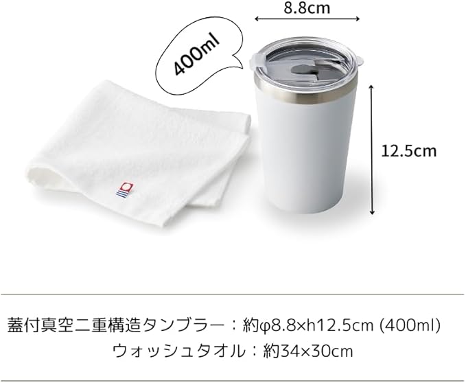 商品(数)、サイズ:蓋付真空二重構造タンブラー(1)約φ8.8 h12.8cm(400ml)、ウォッシュタオル(1)約34 30cm